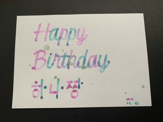 ハッピーバースデーの文字は、先生のお手本があるので、何とかなりましたが、ハングルは、まったくの自己流で書いてますので、ご勘弁を。。。まだまだ、練習が必要ですが。。。