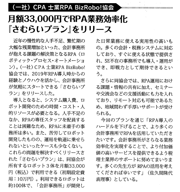 税界タイムスvol.95にて、士業RPA BizRobo!協会の『さむらいプラン』が紹介されました。記事を掲載していますので、よろしければ是非ご一読ください。『さむらいプラン』は当協会が所有するロボットから3体を月額33,000円(税込)から利用できるプランです。多くの会計・税務システムに対応しており、SE不在の事務所でも導入・運用ができ、即戦力として期待できます。今後YouTubeのロボットデモ動画もさらに充実していく予定ですので、是非チェックをお願いいたします!