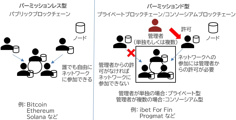 その理由として、今後も新たな仮想通貨が創出される点を考慮して、積極的な定義づけを避けたからでしょう。現在では、法定通貨と連動させたステーブルコインや、特定の発行主体によるセキュリティトークンなどが登場しました。さらに、誰でも参加できるパブリックブロックチェーンに加えて、管理者の許可を必要とするプライベート(コンソーシアム)ブロックチェーンもできました(下図を参照)。