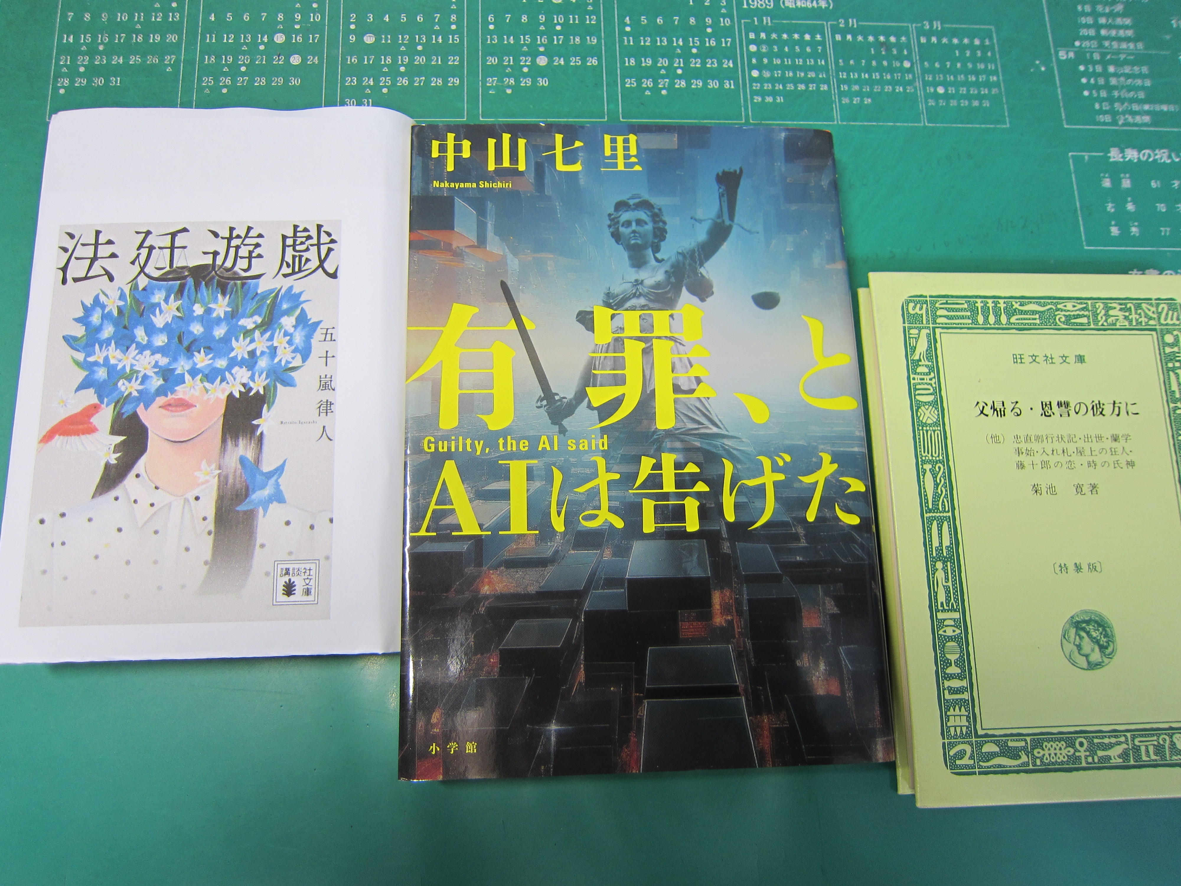 「法廷小説」というジャンルがあります。以前に紹介したアガサ・クリスティーの『検察側の証人』もその一つですが、「法廷ミステリー」の領域まで広げると、多数の作品が出版されています。最近では、『法廷遊戯(2020年)』(五十嵐律人著、講談社文庫)や、『有罪、とAIは告げた(2024年)』(中山七里著、小学館)でしょうか。