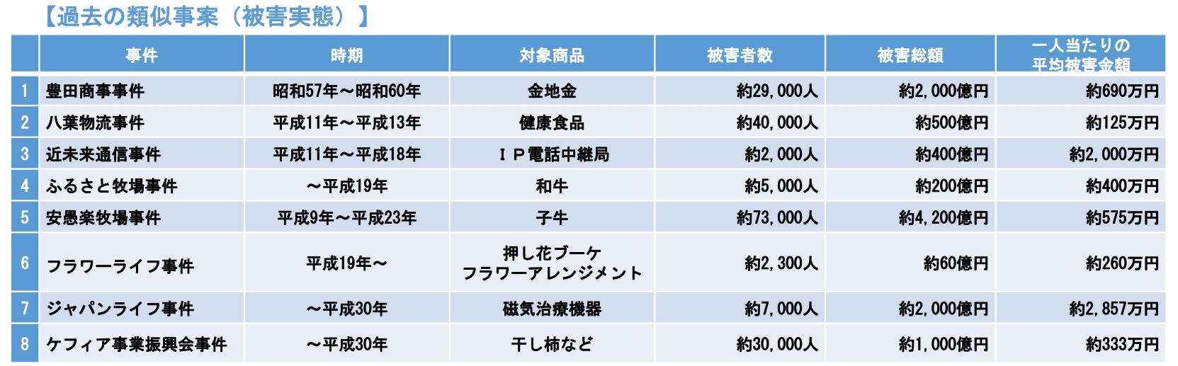 この事件では、「磁気製品を会社に預けてレンタルすれば儲かる」と説明したにもかかわらず、実際には一部しか購入商品を保有せず、中間マージンをエサにして新たな契約者を募ったことで、さらに被害が拡大する結果になりました。本件は、虚偽の説明による「特定商取引に関する法律(特定商取引法)」の違反(不実告知)になったほか、詐欺罪でも立件されています。過去の悪徳商法については、下記の一覧表をご覧下さい。