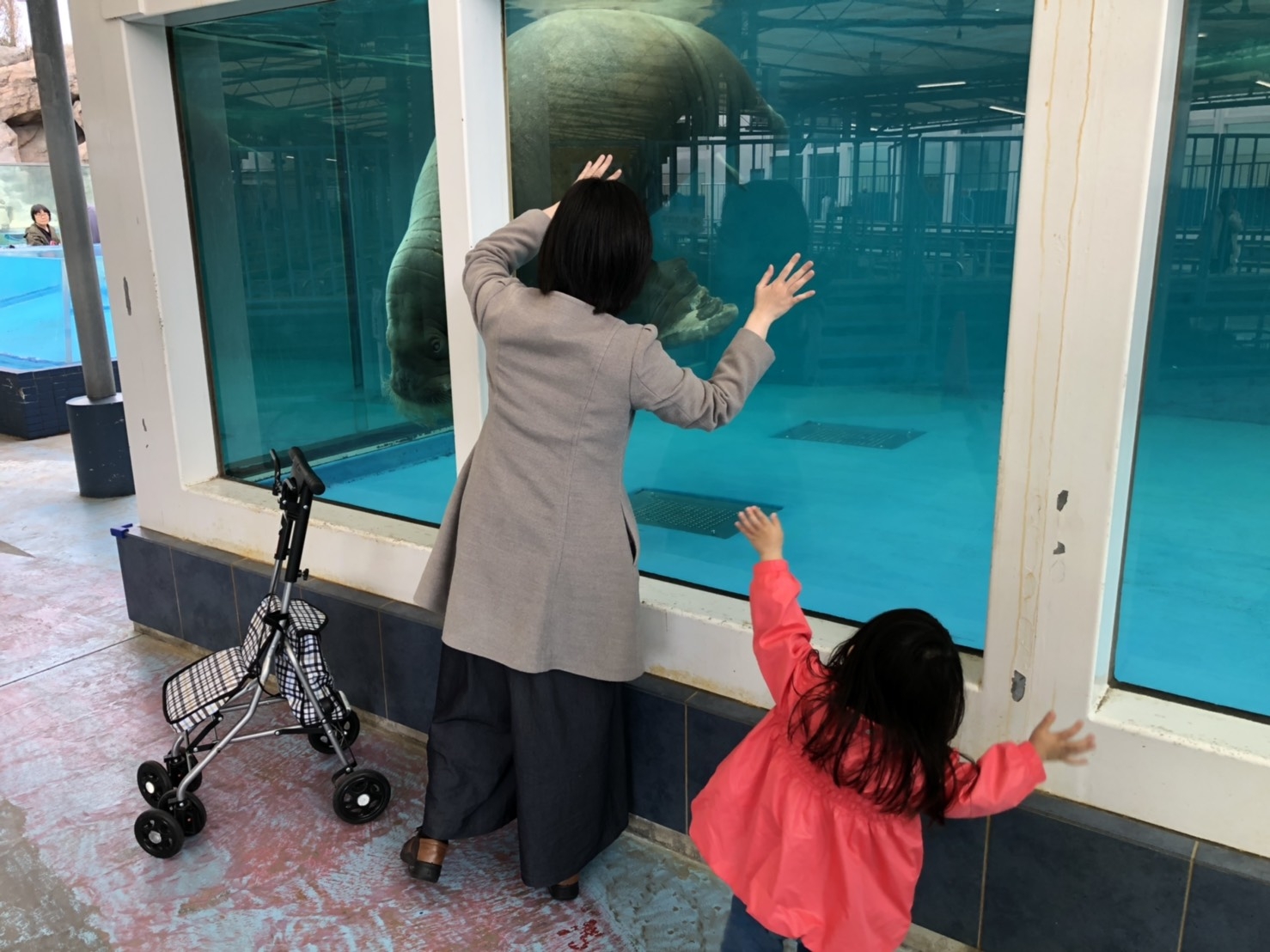 展示が少し暗いお部屋なので、2歳の娘は初めは「怖すぎるー!!」と水槽に近づかなかったのですが、段々慣れてくると「怖すぎる、パパ抱っこしてぇ」と言ってパパの抱っこで楽しみ始め、そのうちに夢中でお魚やイルカを見て喜んでいました。